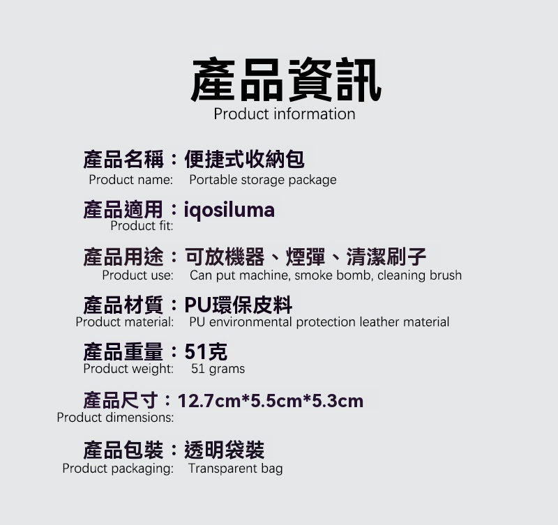 | 產品用途 | 可放置機器、煙彈、清潔刷子 |