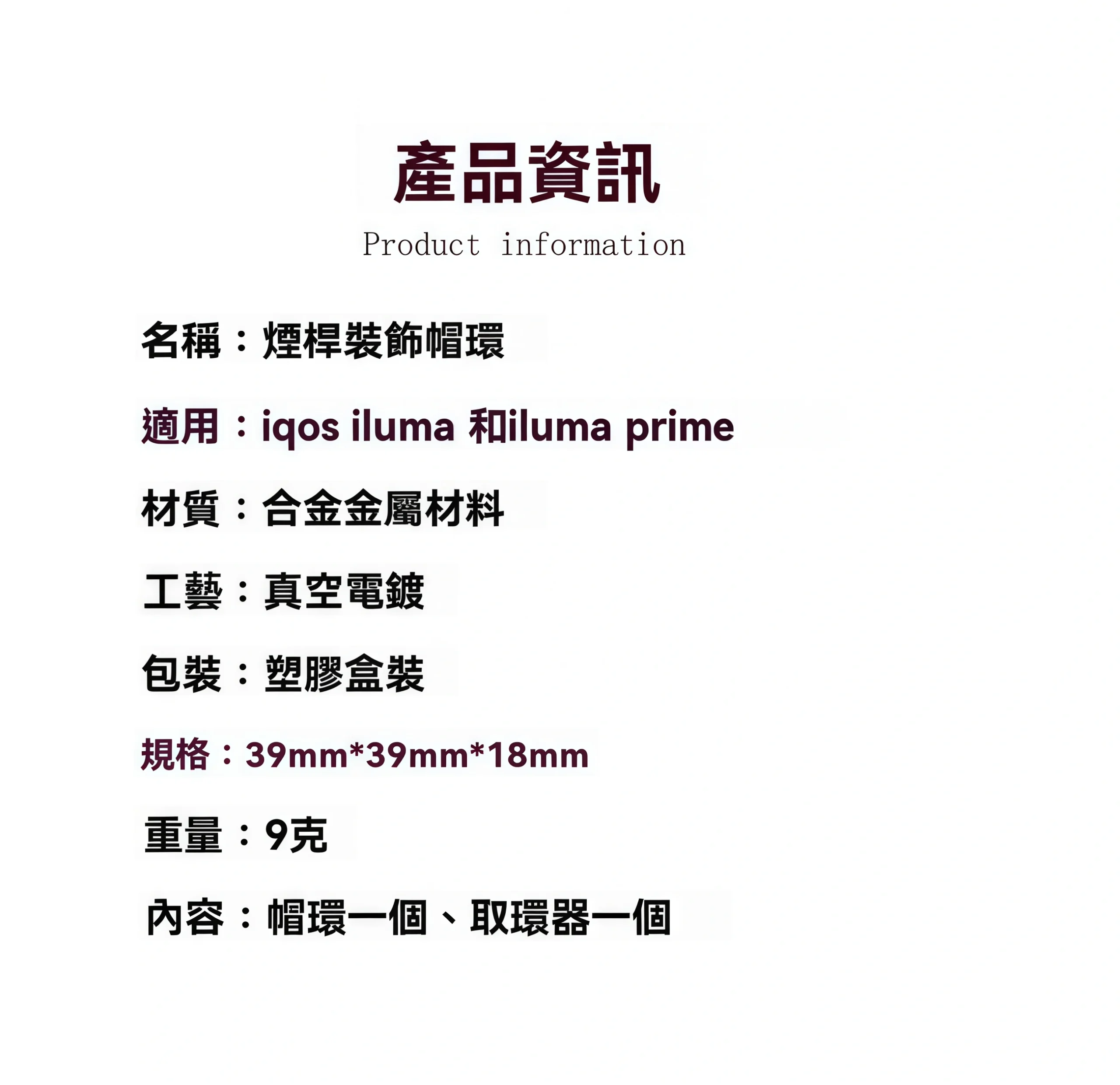 ILUMA PRIME 煙桿裝飾環產品規格(Specifications)