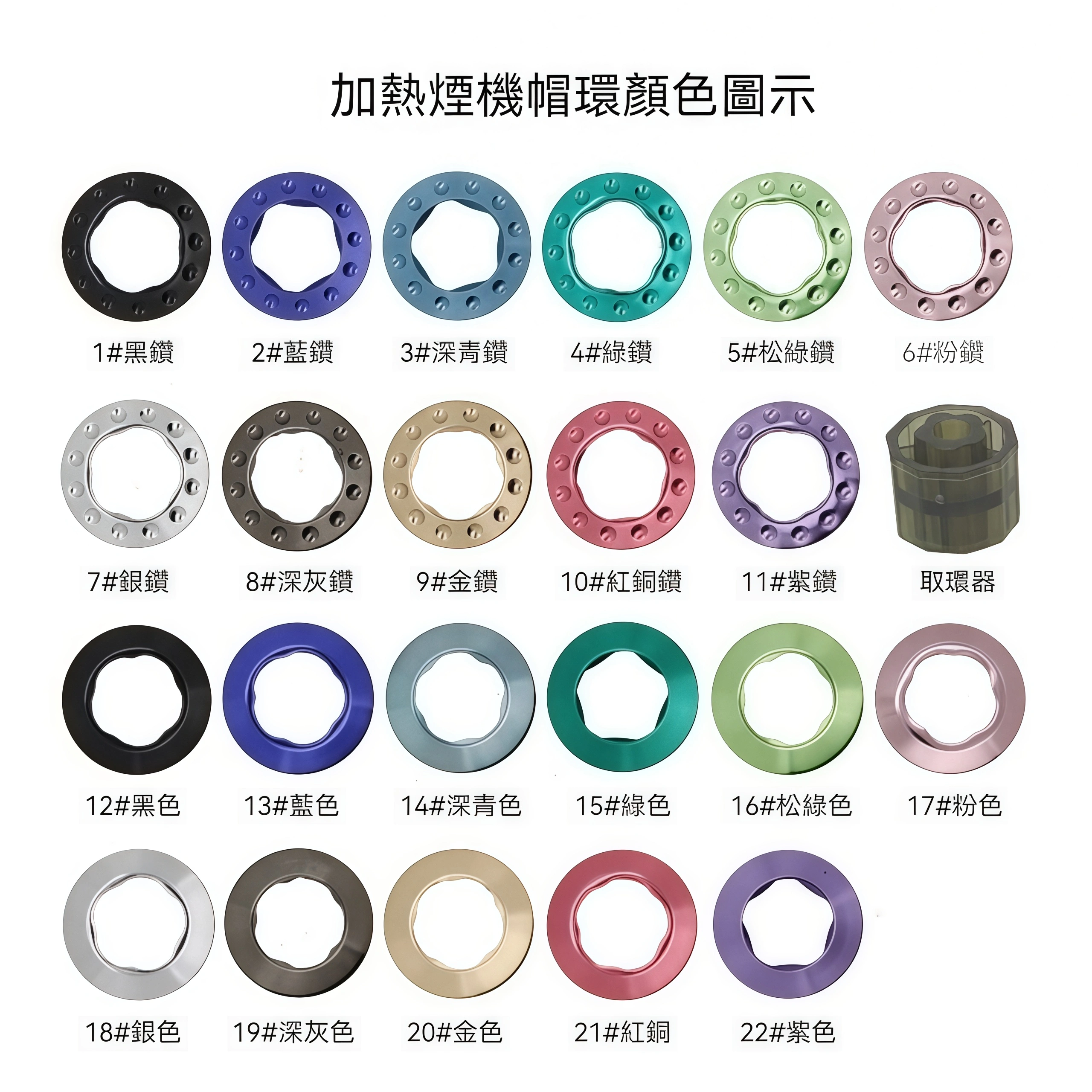 這款 煙桿裝飾帽環 採用合金金屬材質與真空電鍍工藝,色澤細膩、不易褪色,支援快速拆裝,輕鬆更換外觀,讓加熱煙機更具個人特色。