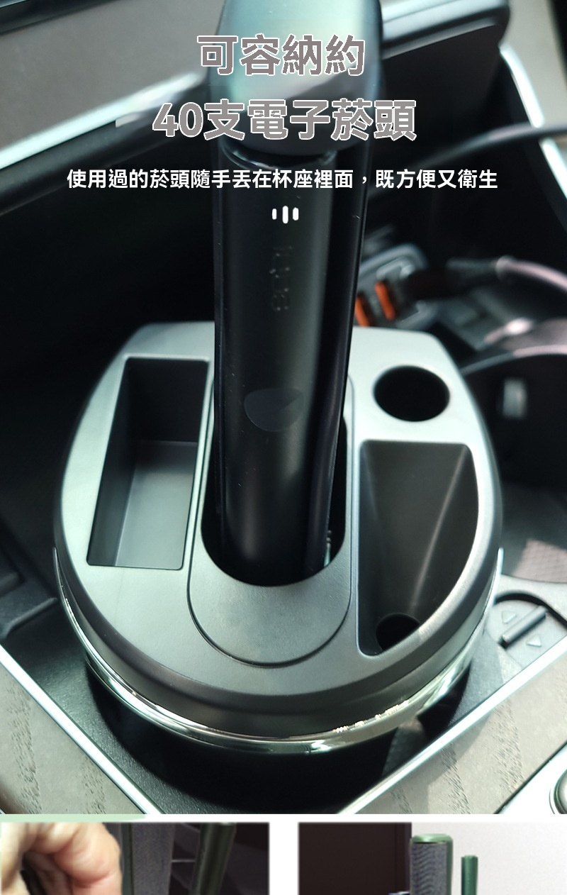 從圖片可見,本款產品可穩固放置於 汽車中央扶手或杯架位置,外型簡潔、功能齊全,是有抽菸或使用電子煙車主的實用選擇。